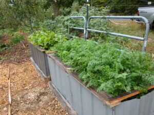 Our new vole-thwarting raised beds and barrels are working well, especially for carrots and beets. We used found materials of imperfect metal roofing and wood pieces to construct four more that are extra tall. We create the soil in them using sheet mulch and hugelkultur techniques – rotting wood, manure, animal bedding, fallen leaves and seaweed, topped by finished compost to plant into. So far, voles have not infiltrated them, and the height makes them much easier to access and care for.